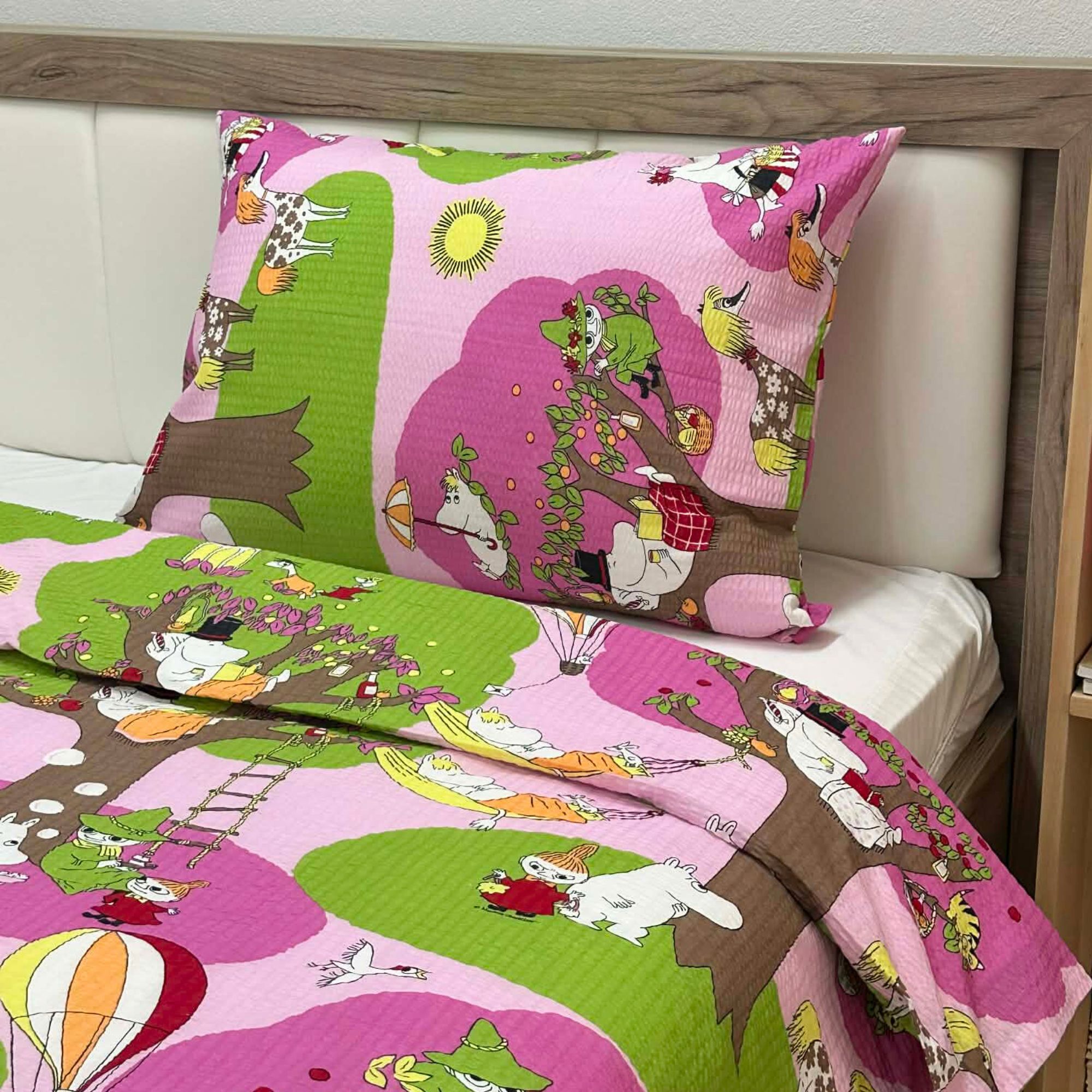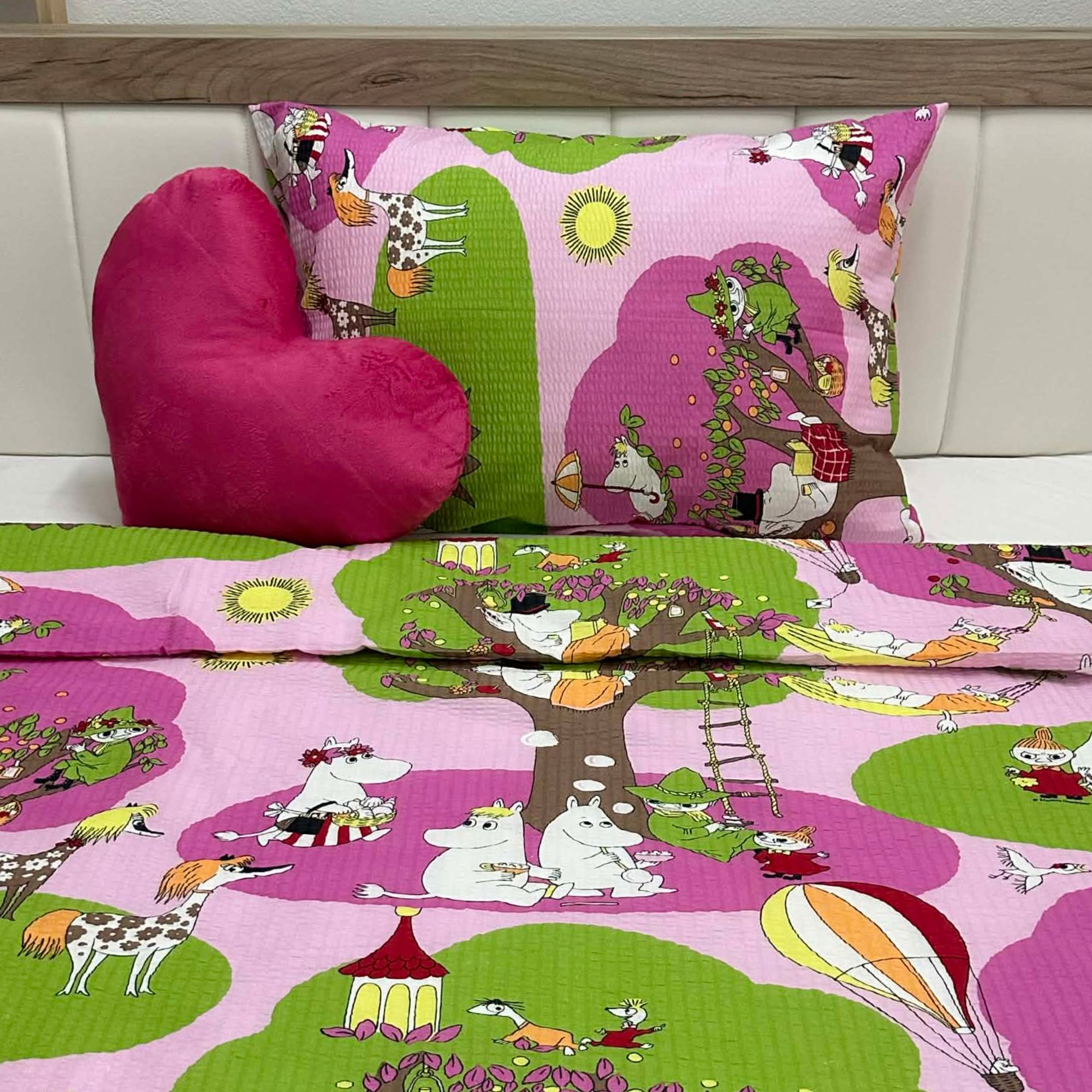 Ušuškajte se u svet nežnih snova uz posteljinu od 100% pamučnog krepa sa prepoznatljivim Moomin motivom Dreaming. Mekana i prijatna na dodir, idealna je za miran san tokom cele godine. Pamučni krep se ne gužva lako i ne zahteva peglanje, što je čini savršenim spojem udobnosti i praktičnosti. Ilustracija u veselim tonovima unosi toplinu, maštu i osećaj bezbrižnosti u svaku spavaću sobu – kako za decu, tako i za odrasle koji vole malo čarolije pred spavanje.